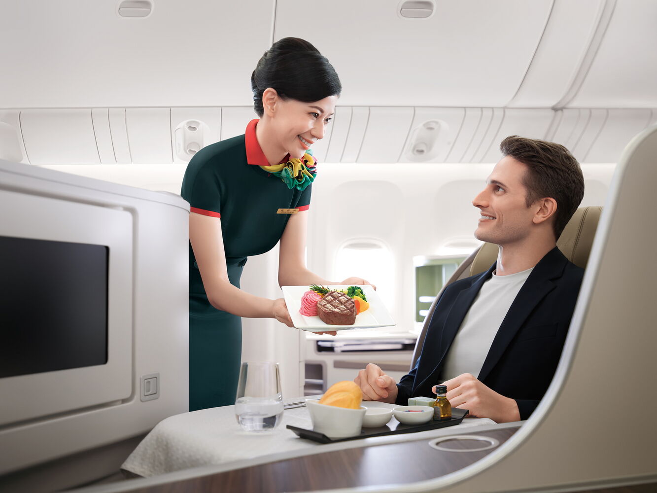 Jeder Sitz ist mit einem eigenen Touchscreen-System ausgestattet, das eine vielfältige Auswahl an Filmen, Serien, Musik und Spielen bietet. Dank Memory-Foam-Polsterung und ergonomischem Sitzaufbau bleibt der Komfort auch auf längeren Strecken erhalten. Die freundlich gestaltete, helle Kabine und das aufmerksame Crew-Team tragen zusätzlich zu einem rundum angenehmen Reiseerlebnis bei.